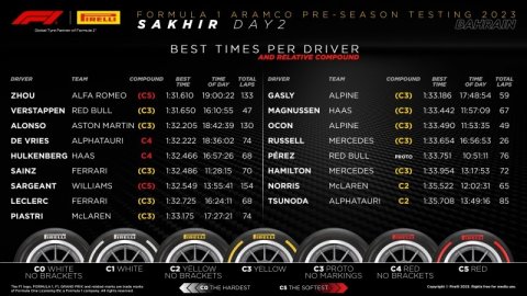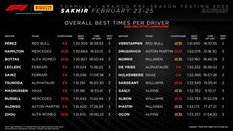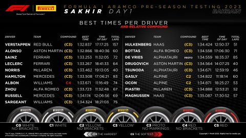 Efter middagspauser var det så den dobbelt verdensmester til at prøve kræfter i den nye AMR23. Og det kom nok som lidt af en overraskelse da Alonso noterede sig for dages næstbedste kun 0,027 sek. Fra Verstappens bedste tid og med ikke mindre end 97 færre tilbagelagte omgange. En journalist skrev, ”Var dette i Q3 om 9 dage, ville stemningen være euforisk” men det var det ikke, men bare dag 1 i ørkenstaten, men der vil utvivlsom være flere blikke der retter sig imod Aston Martin pit garage de næste 2 dage.